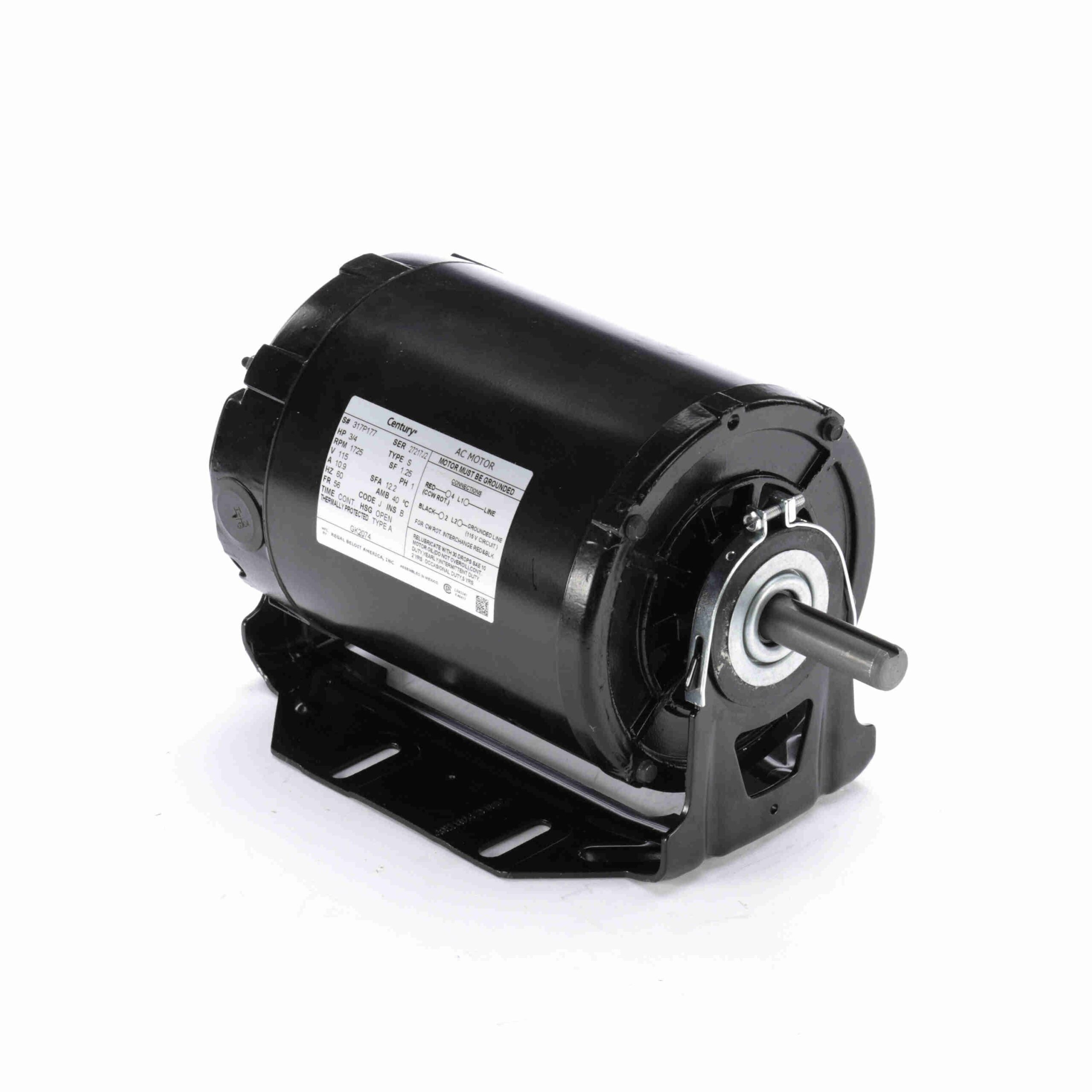 They feature 1 phase, 3/4 HP, 115 Voltage Rating, 1800 RPM Speed, Resilient Base mounting, 10.9 Amps, B Insulation Class, Continuous Duty, OAO Enclosure Type. As trusted Century Motors motor suppliers and dealers, we make it easy to find the right model for industrial, commercial, or HVAC use.